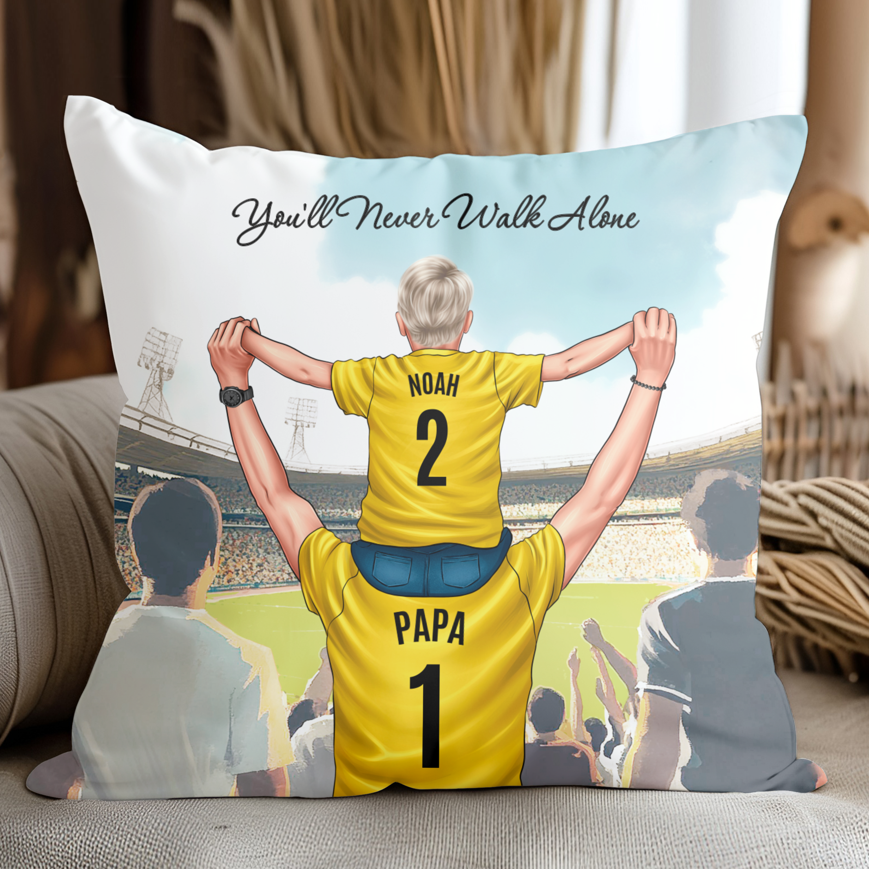 Papa und Kind beim Fußball im Stadion - Personalisiertes Kuschelkissen