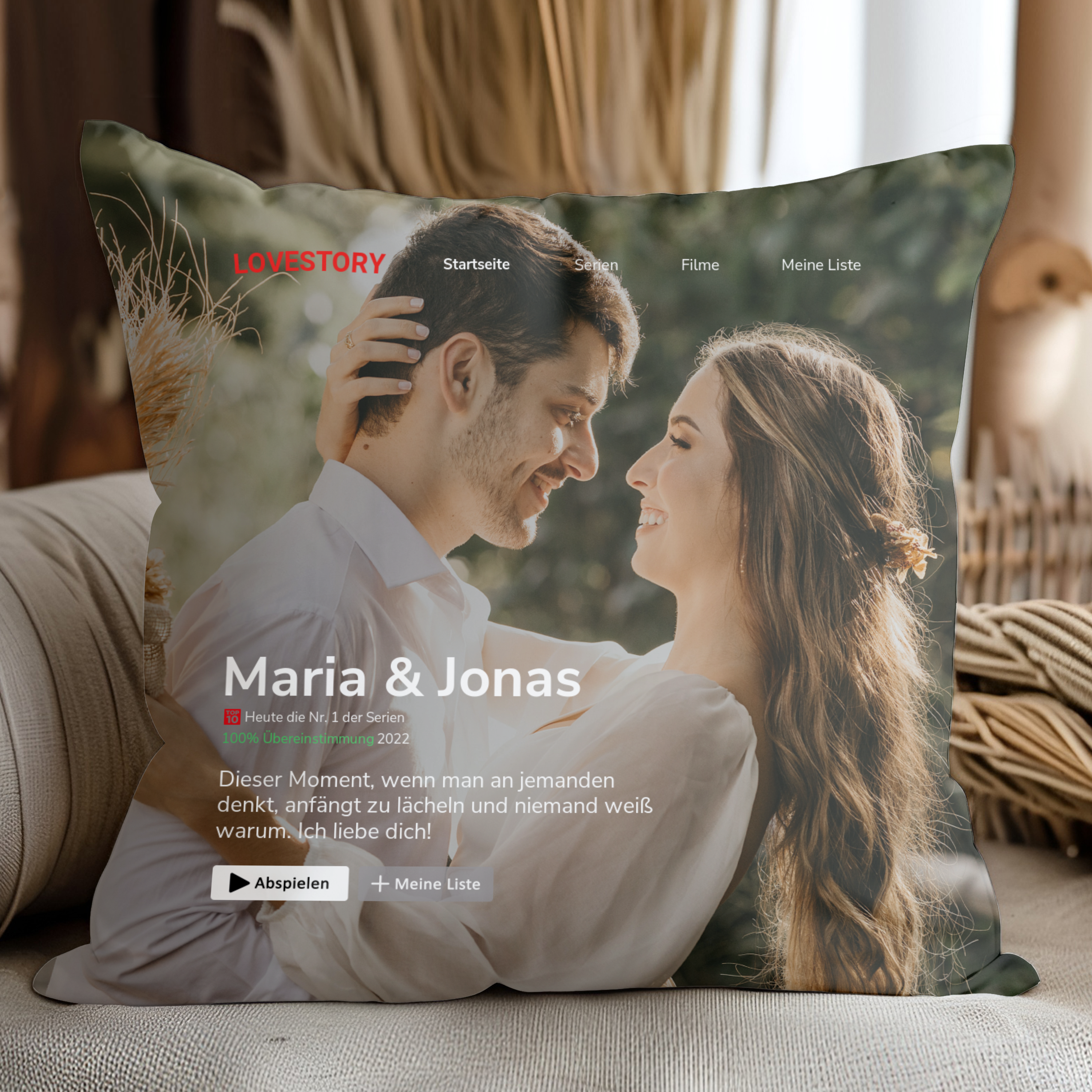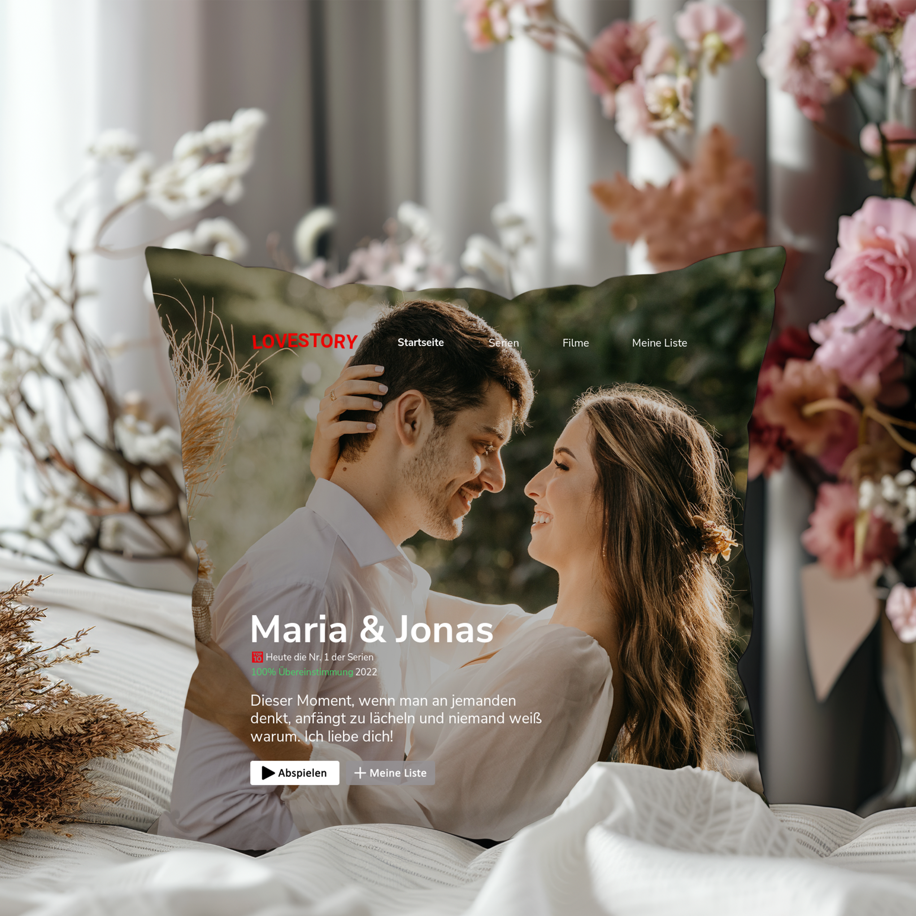 Lovestory wie bei Netflix - Personalisiertes Kuschelkissen mit Foto für Paare