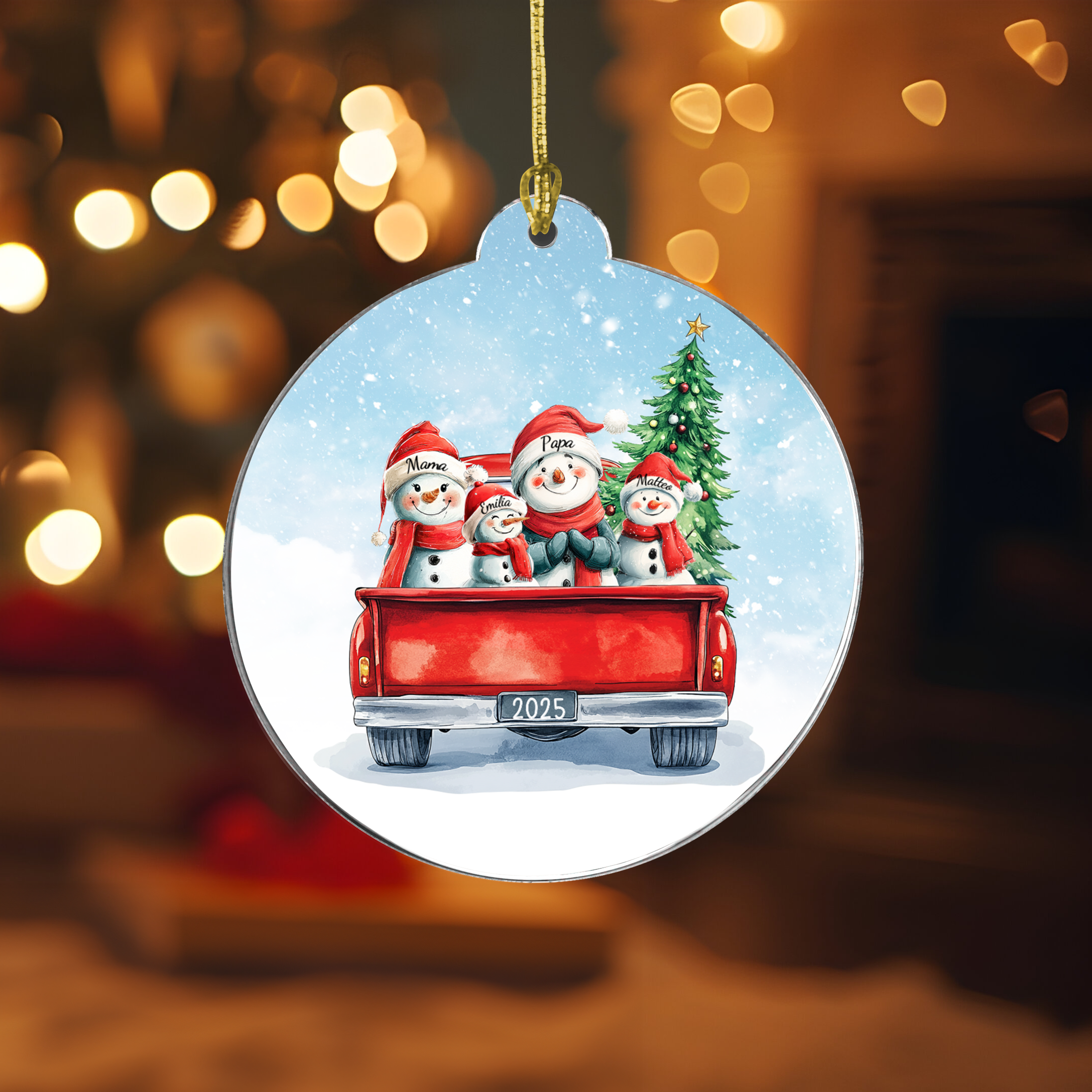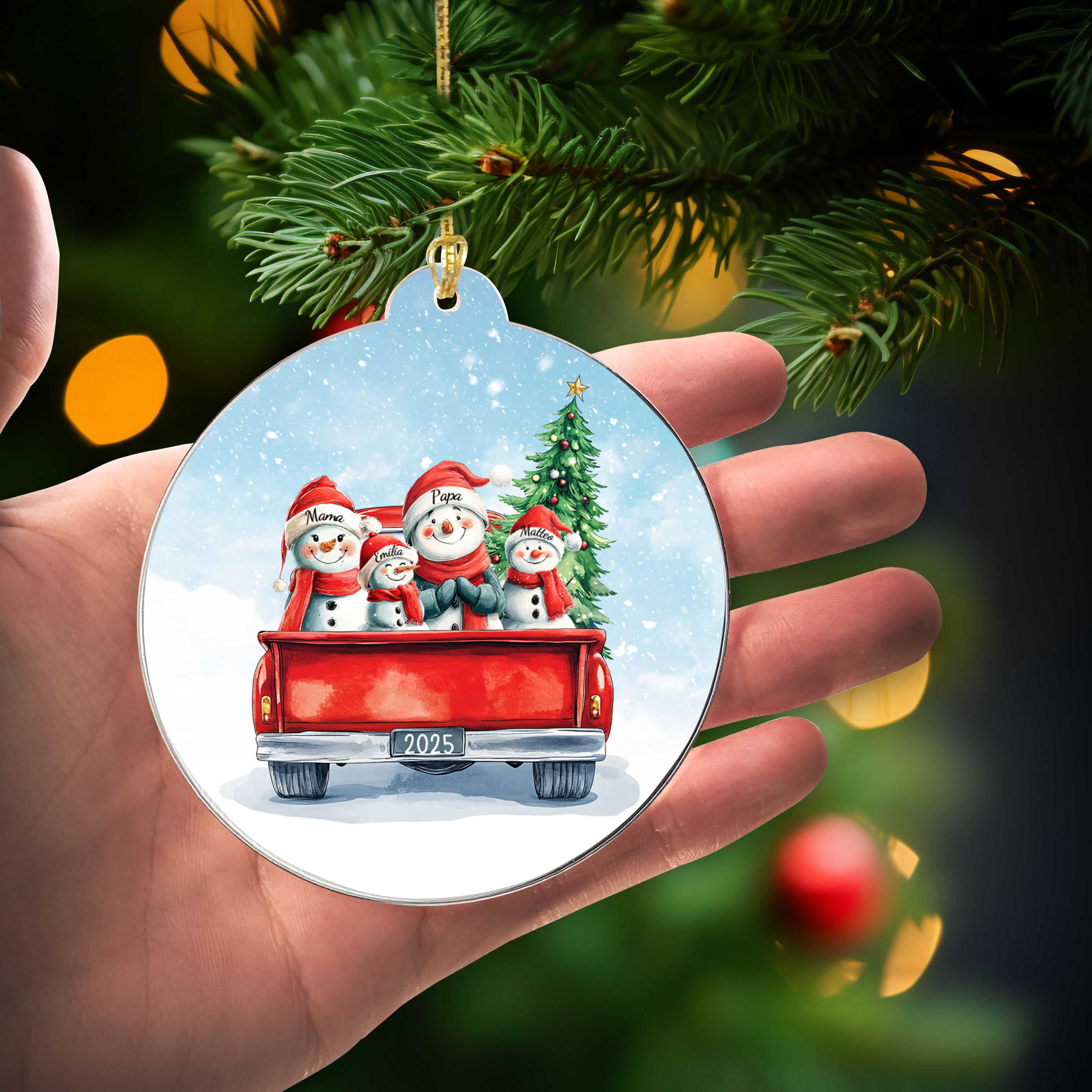 Schneemann Familie im Auto - Personalisierter Christbaumschmuck
