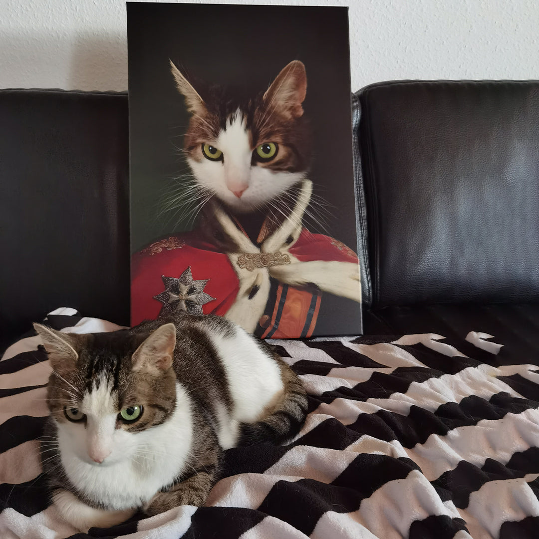 Normale Fotos von ihren Haustieren haben viele Tierfreunde in ihrer Wohnung hängen. Doch bei diesem Tier-Portrait wird Deine Fellnase in einen purpurroten Königsmantel mit weißem Hermelinkragen gehüllt, um seinen stolzen Charakter zu unterstreichen. Im Wohnzimmer oder im Flur präsentiert, ist das königliche Portrait dadurch ein individueller Hingucker, den nicht jeder hat und der garantiert für bewundernde Blicke sorgt. Deshalb kommen unsere royalen Tier-Portraits auch als Geschenk so gut an – Überraschungsfaktor inklusive.