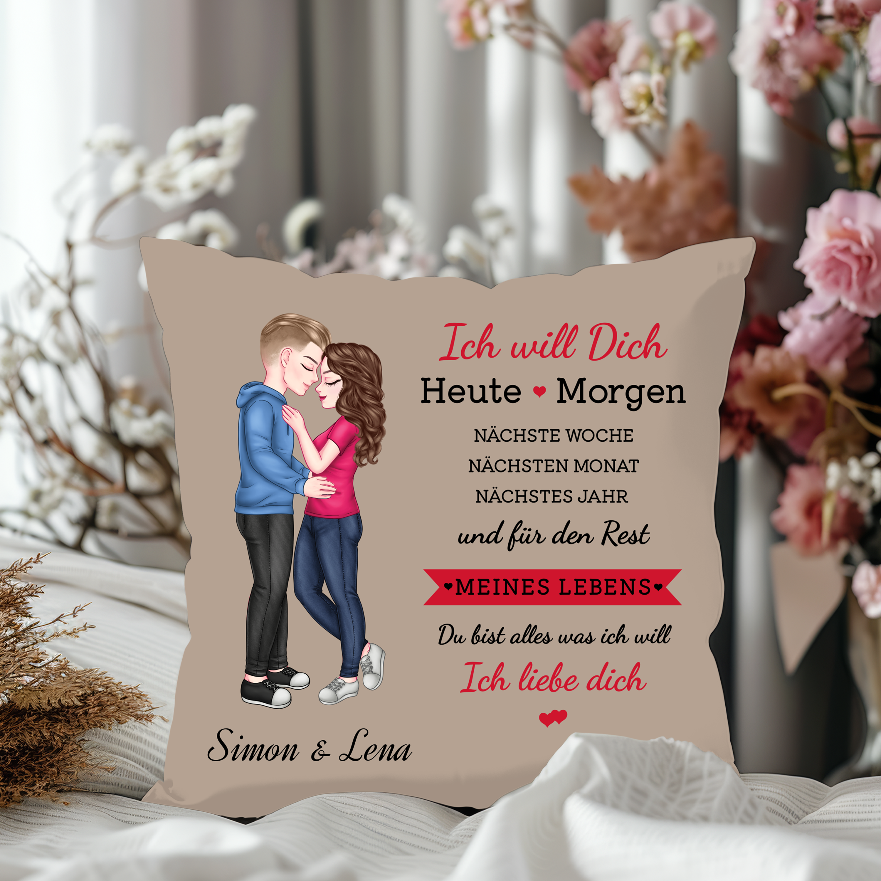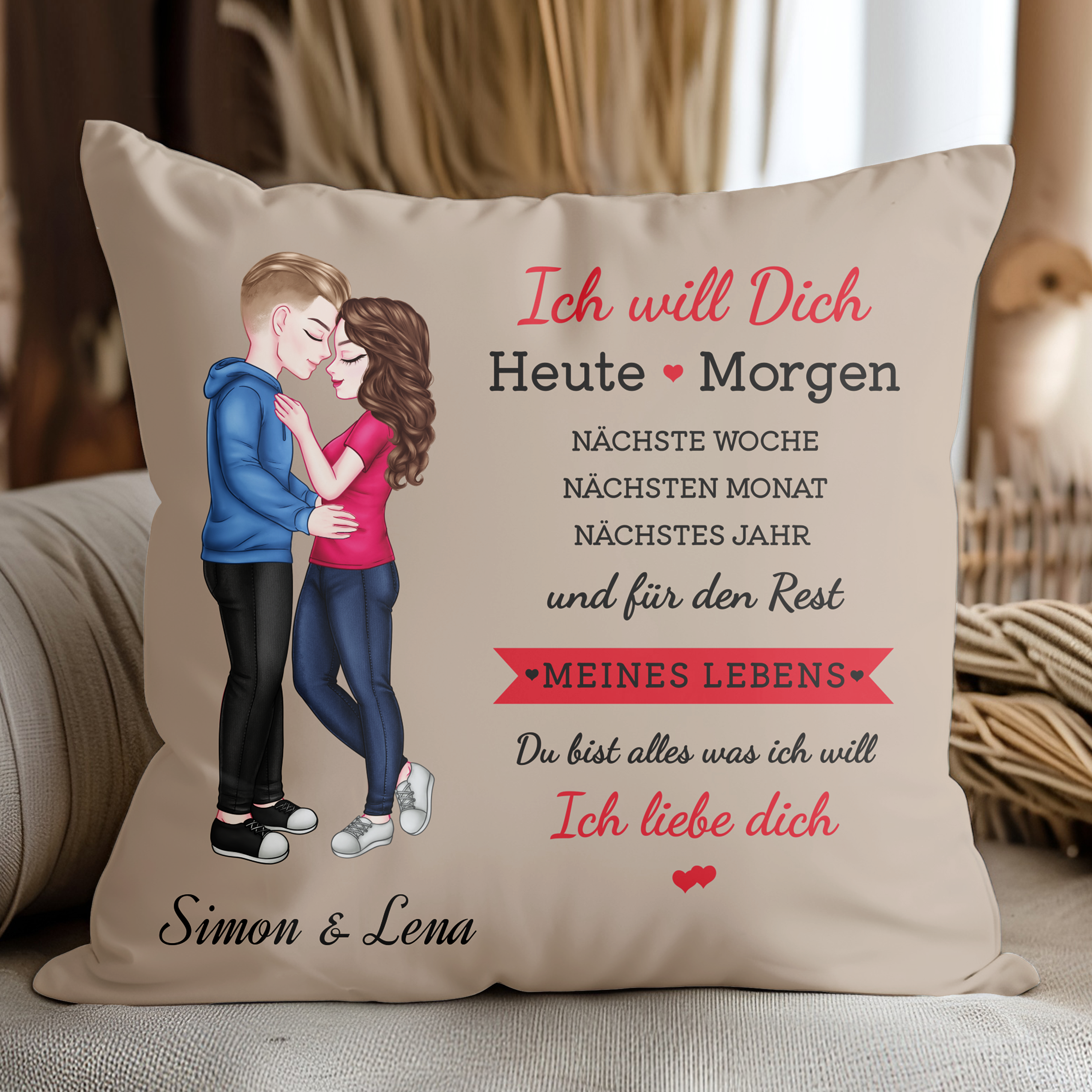 Ich will dich - Personalisiertes Kissen für Paare in Dunkel Beige
